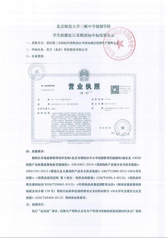 北京师范大学三帆中学朝阳学校学生校服征订采购招标中标结果公示