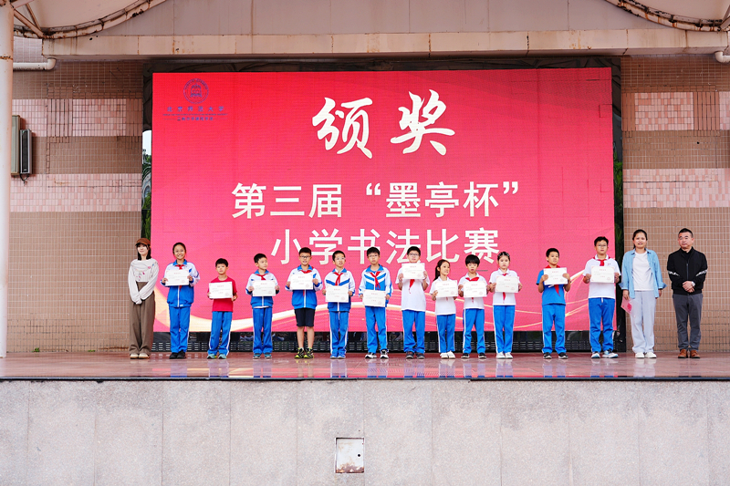 国旗下讲话后,校领导为获得第三届“墨亭杯”书法比赛获奖的学生颁奖。(供稿 学生处)