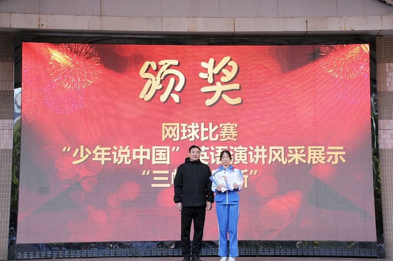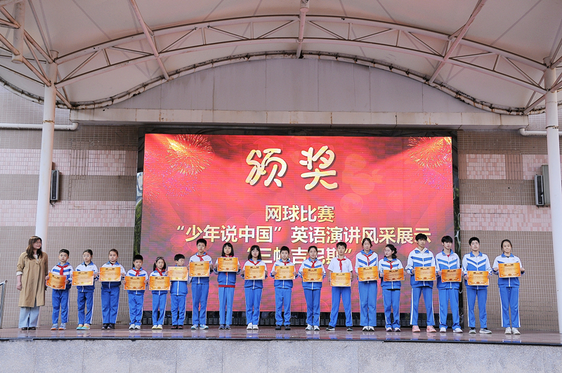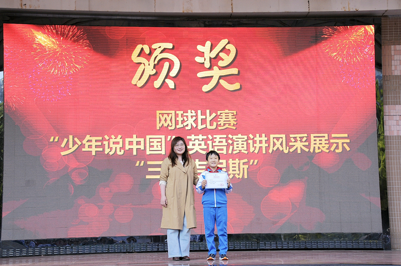 国旗下讲话后,校领导为获得网球、英语比赛、校运动会新“吉尼斯纪录”的学生颁奖。(供稿 学生处)